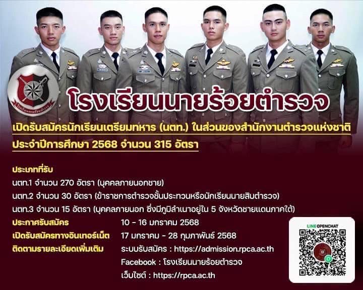 โรงเรียนนายร้อยตำรวจ เปิดรับสมัครนักเรียนเตรียมทหาร (นตท.) ในส่วนของสำนักงานตำรวจแห่งชาติ ประจำปีการศึกษา 2568 จำนวน 315 อัตรา