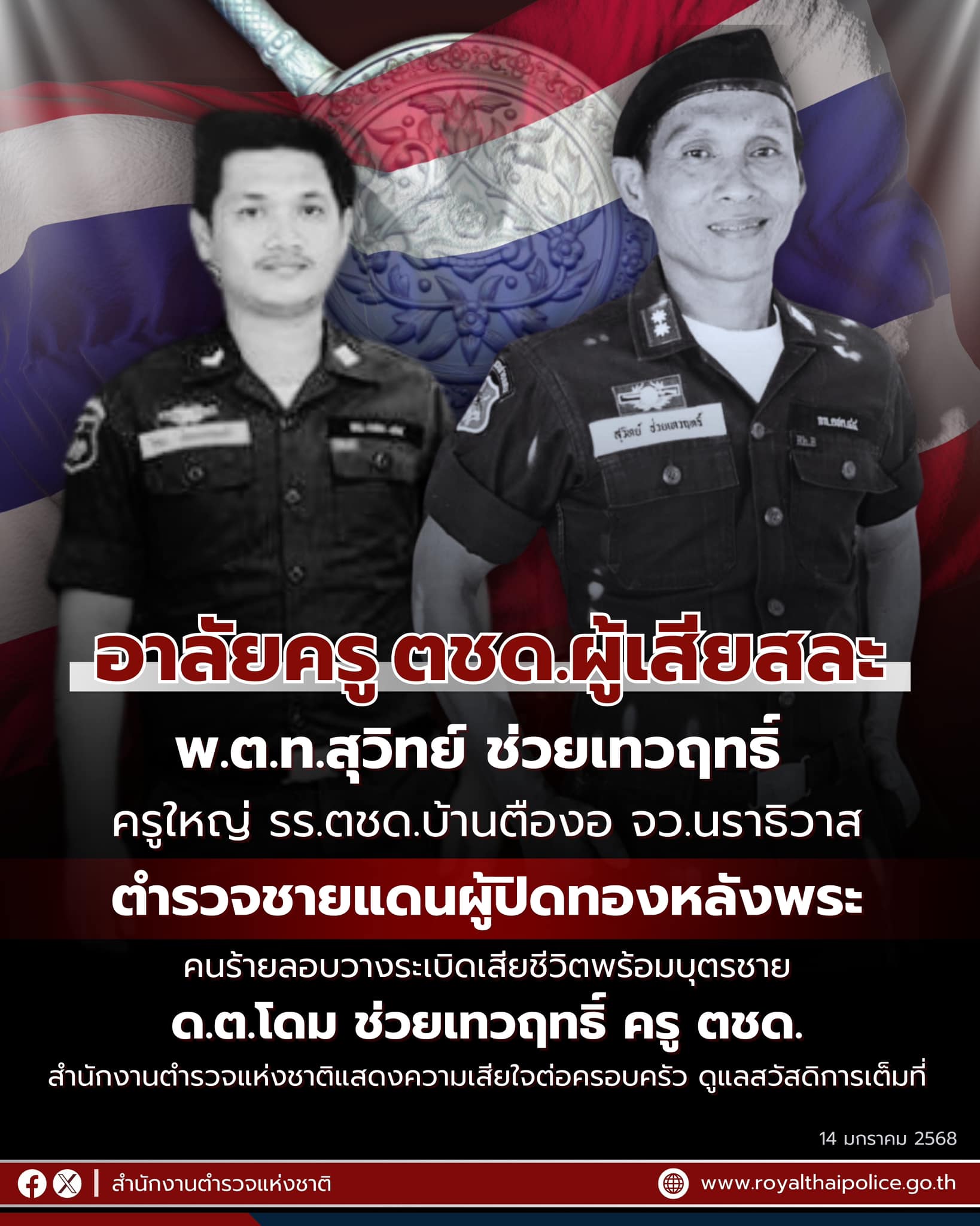 สำนักงานตำรวจแห่งชาติขอแสดงความอาลัยอย่างสุดซึ้ง ต่อ พ.ต.ท.สุวิทย์ ช่วยเทวฤทธิ์ ครูใหญ่ โรงเรียนตำรวจตระเวนชายแดนบ้านตืองอ อ.ศรีสาคร จว.นราธิวาส และ ด.ต.โดม ช่วยเทวฤทธิ์ ครู ตชด.